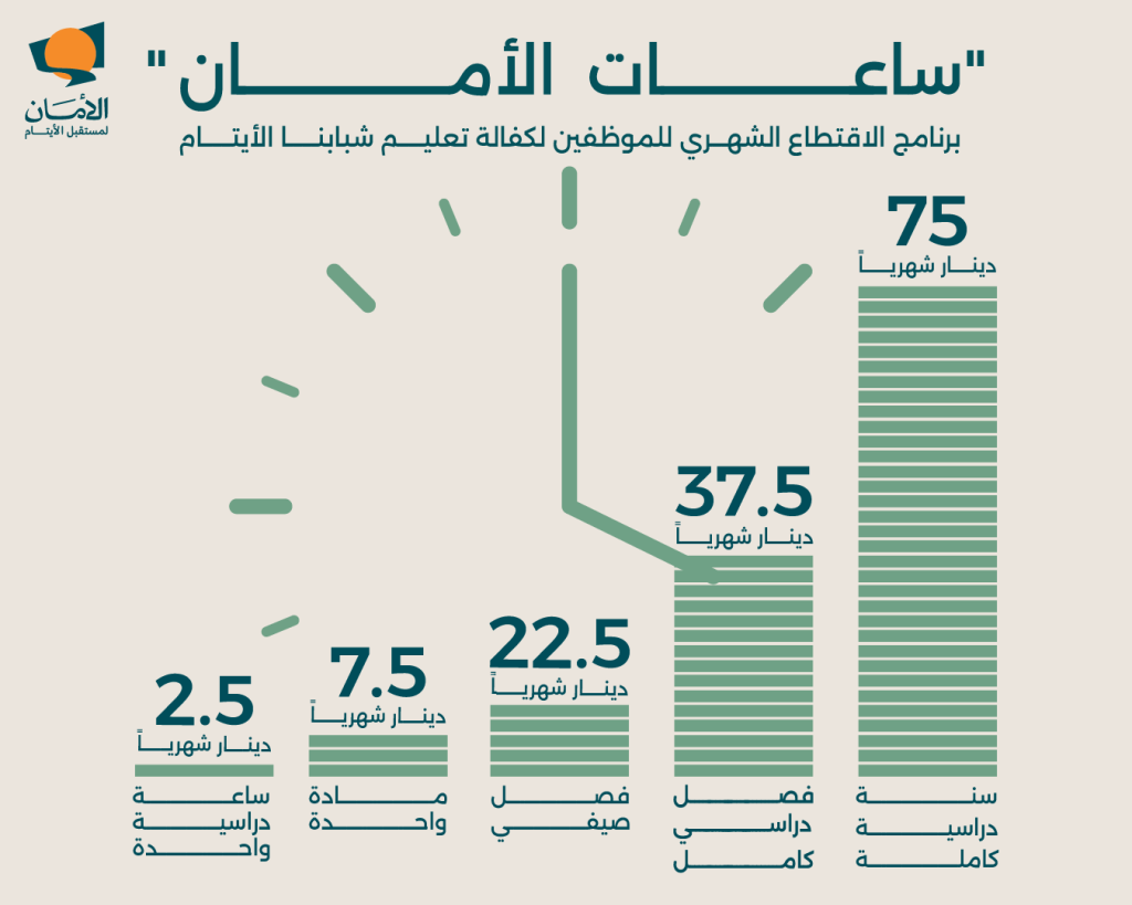 • 75 دينار شهرياً = تعادل سنة دراسية كاملة (30 ساعة دراسية)