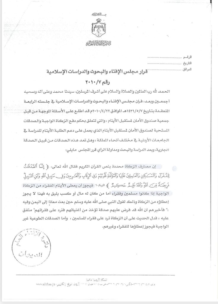 Al Aman Fund for the Future of Orphans holds an official Fatwa from the Jordanian Iftaa Department (Fatwa No. 7/2010), which permits the use of Zakat funds to support orphaned youth over the age of 18 who do not have financial means.